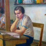 Астраханская картинная галерея имени П.М. Догадина предоставила работу К. Петрова-Водкина «Девочка за партой» (1934). В собрание Астраханской картинной галереи работа поступила по приказу Министерства культуры РСФСР в ноябре 1971 года из Государственного Русского музея. Моделью для портрета стала дочь художника Елена, которую он неоднократно изображал в своих известных произведениях. На картине изображена девочка за партой, прилежно читающая, и её детский мир: игрушки, кукла, глобус, книги. Кроме того, художник использует зеркало как элемент отражения особого мира, окружающего его дочь.