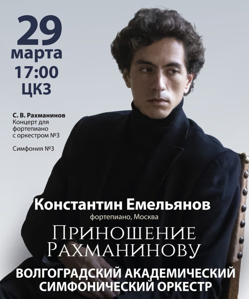 Первое отделение откроется признанным шедевром Сергея Рахманинова – Концертом для фортепиано с оркестром №3. В сопровождении Волгоградского академического симфонического оркестра под управлением маэстро Андрея Аниханова его исполнит Константин Емельянов – лауреат многочисленных музыкальных конкурсов, ученик профессоров Московской консерватории Сергея Доренского и Николая Луганского, солист Московской филармонии.