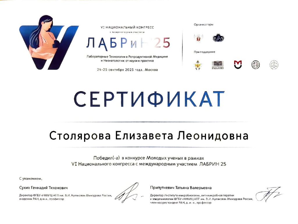 На конкурсе молодых ученых, в рамках прошедшего в Москве в сентябре VI Национального конгресса с международным участием «Лабораторные технологии в репродуктивной медицине и неонатологии», работа студентки Волгоградского государственного медицинского университета Елизаветы Столяровой «Корреляция тромбоцитов с sFlt-1 и PLGF при преэклампсии» была признана лучшей.